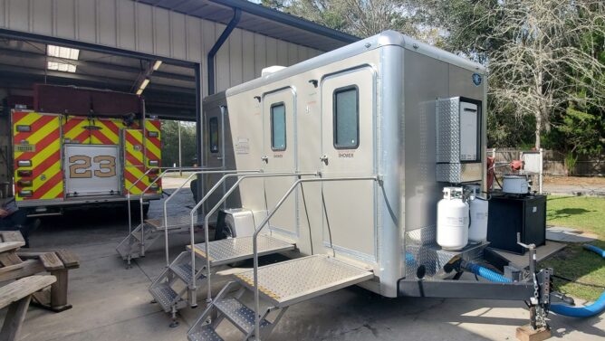 Our 3-stall shower combo Bathroom trailers feature individual shower rooms that include a toilet, sink and provides several elements that make a ‘just like home’ experience including luxury vinyl floors, running sinks, porcelain toilets and radio.